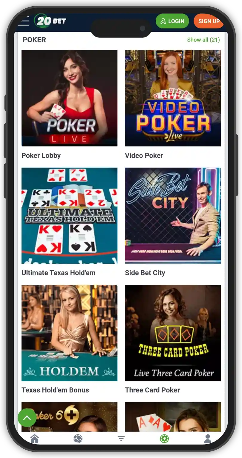 20bet Casinos diverse library is powered by 64 popular and less-known game providers, offering a great selection of games in every category. Over 7,000 games are available, including a sizable collection of progressive jackpots and megaways slots. 20bet Casino offers hundreds of virtual table and card games, including many poker variations.