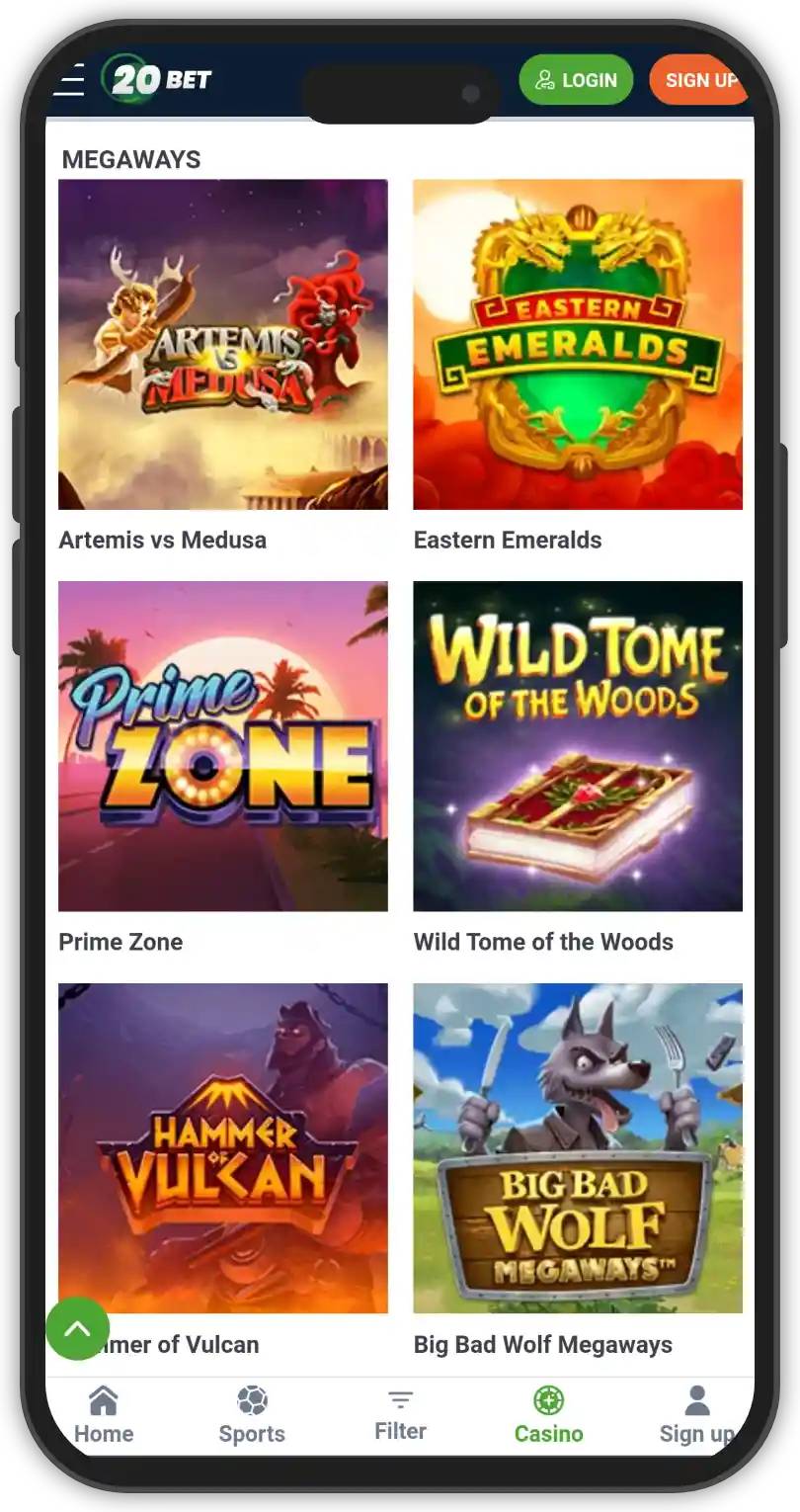 20bet Casino is accessible from any device. The website was developed to run on PCs and devices such as mobile phones or tablets. If you want to skip opening the website on your smartphone or tablet, you can always download the 20bet Casino app directly from the casino’s website.
