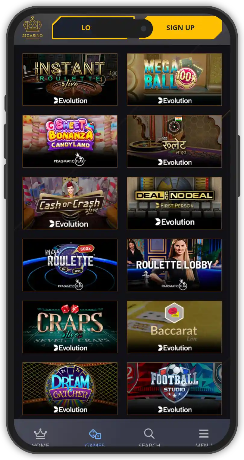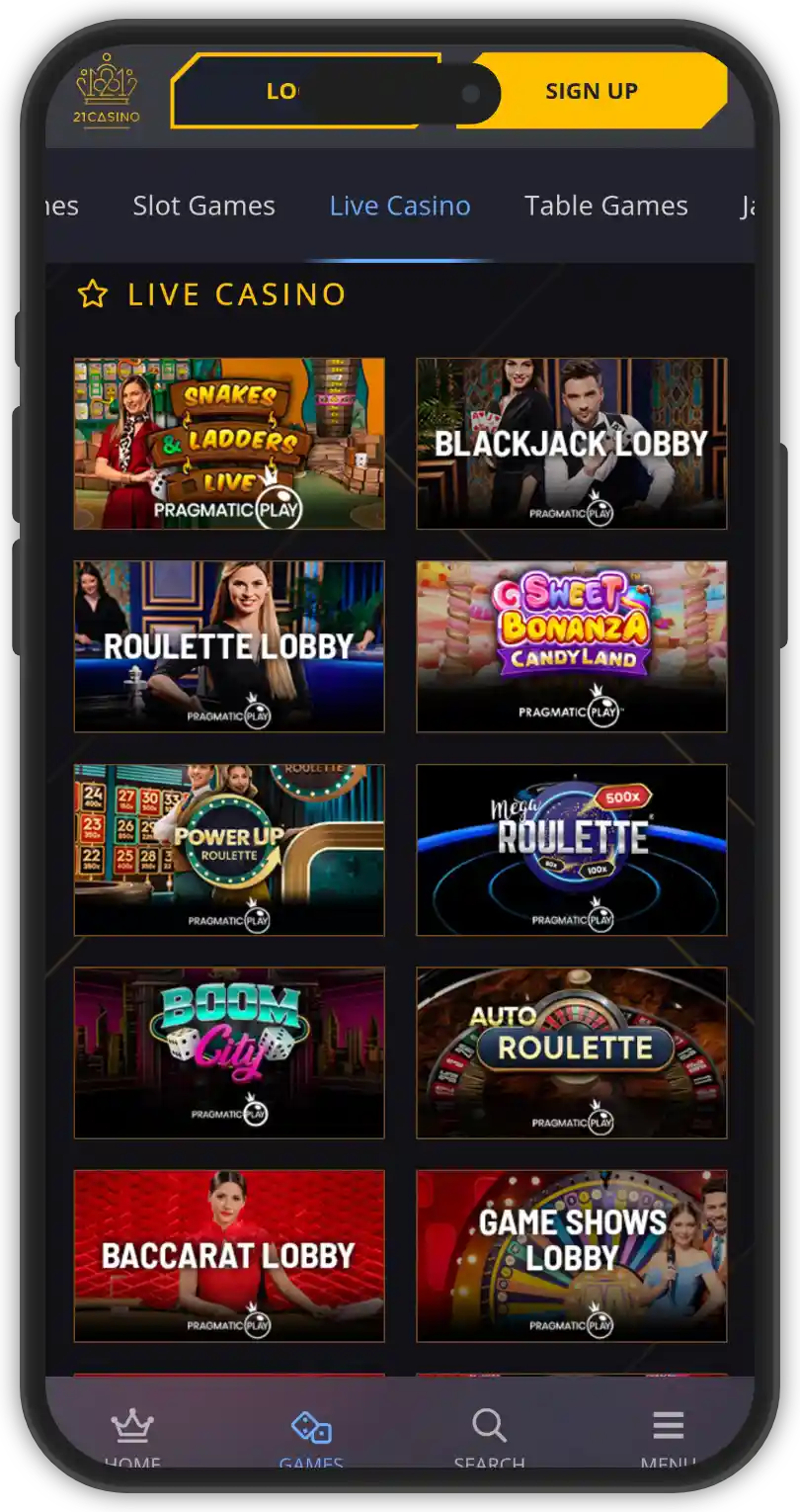 As previously mentioned, 21 Casino positions itself primarily as a slots-focused platform, and as a result, the live dealer section on the website lacks variety and is very limited. Players can access the live casino section and choose from a few live dealer card games, but it’s noteworthy that live poker tables are not included in the offerings. If you’re intrigued by live game shows, you’ll find them most prominently featured at 21 Casino, and the offer includes highly popular titles like Boom City, Snakes and Ladders Live and Sweet Bonanza Candyland.