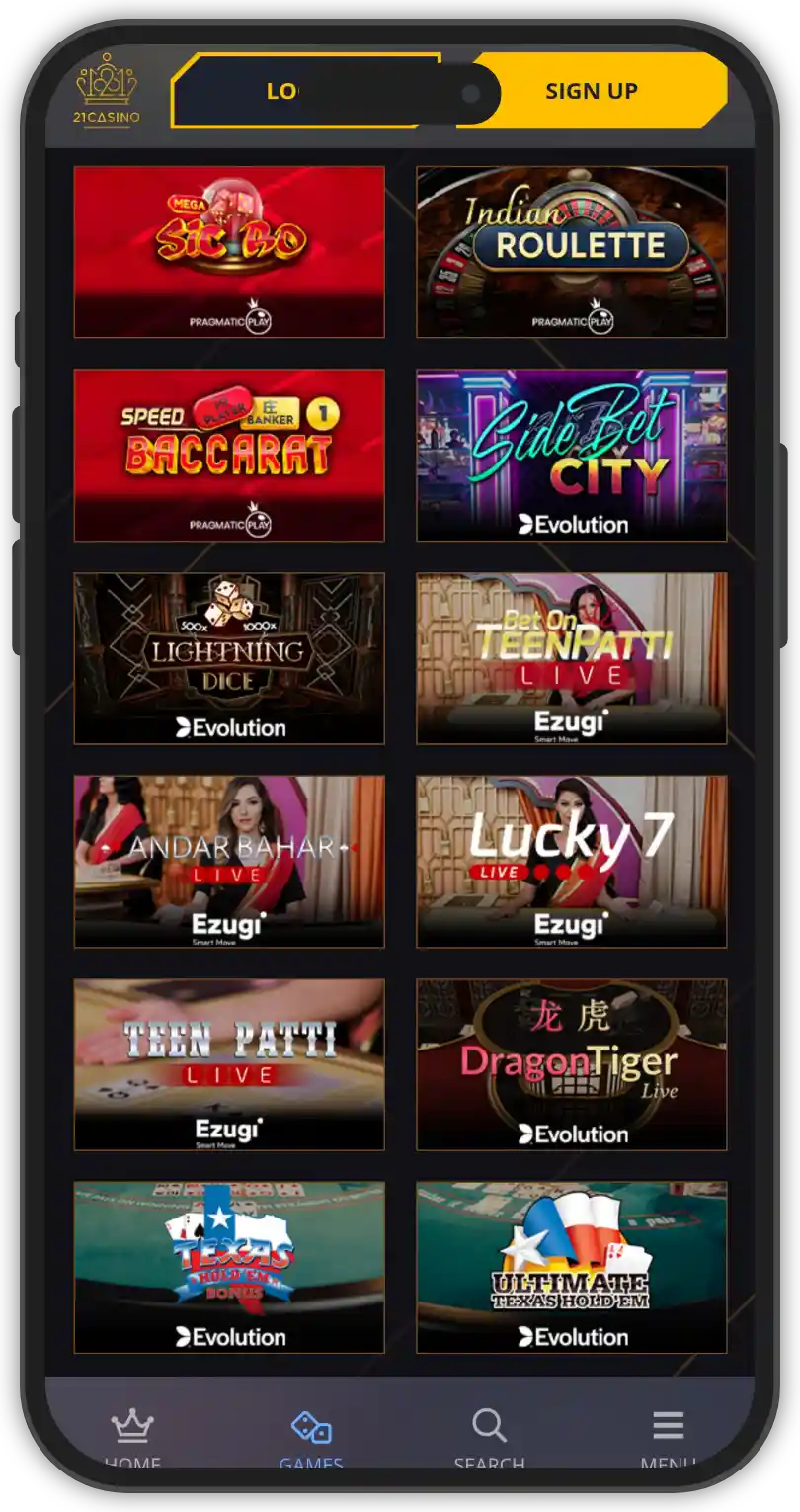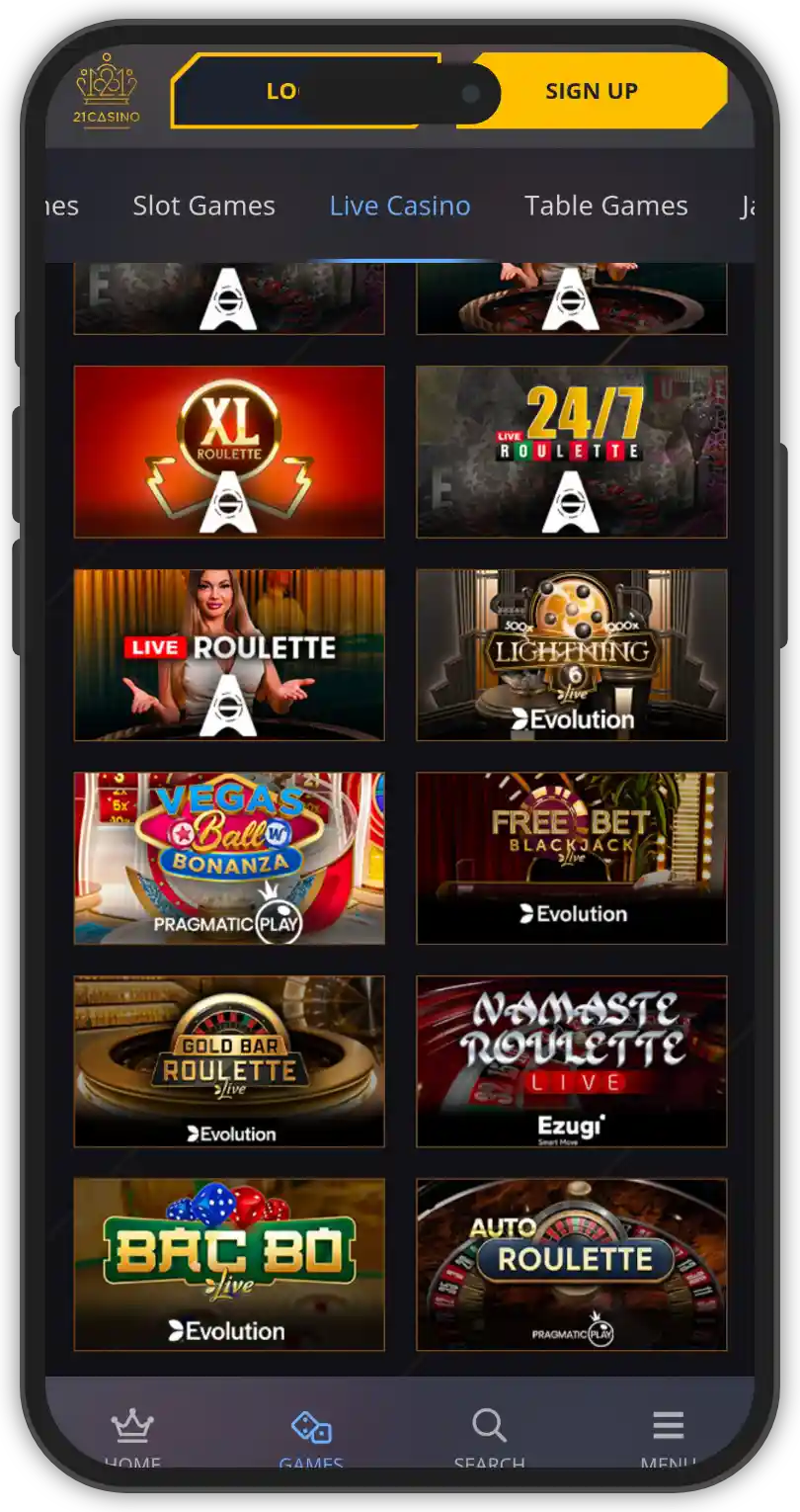 The live dealer section at 21 Casino is powered by Pragmatic Play Live and Ezugi.
