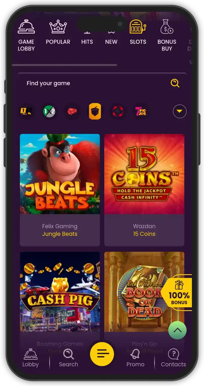 You can play all kinds of slots, jackpots, RNG table games, and live dealer titles too. We have to say that the game lobby is decently organized. All the latest slots are displayed first so you know you’re in for a fun ride with the biggest hits. You can browse the games per provider or use the filters such as Popular, Hits, and New, or use the Search bar to find your faves.