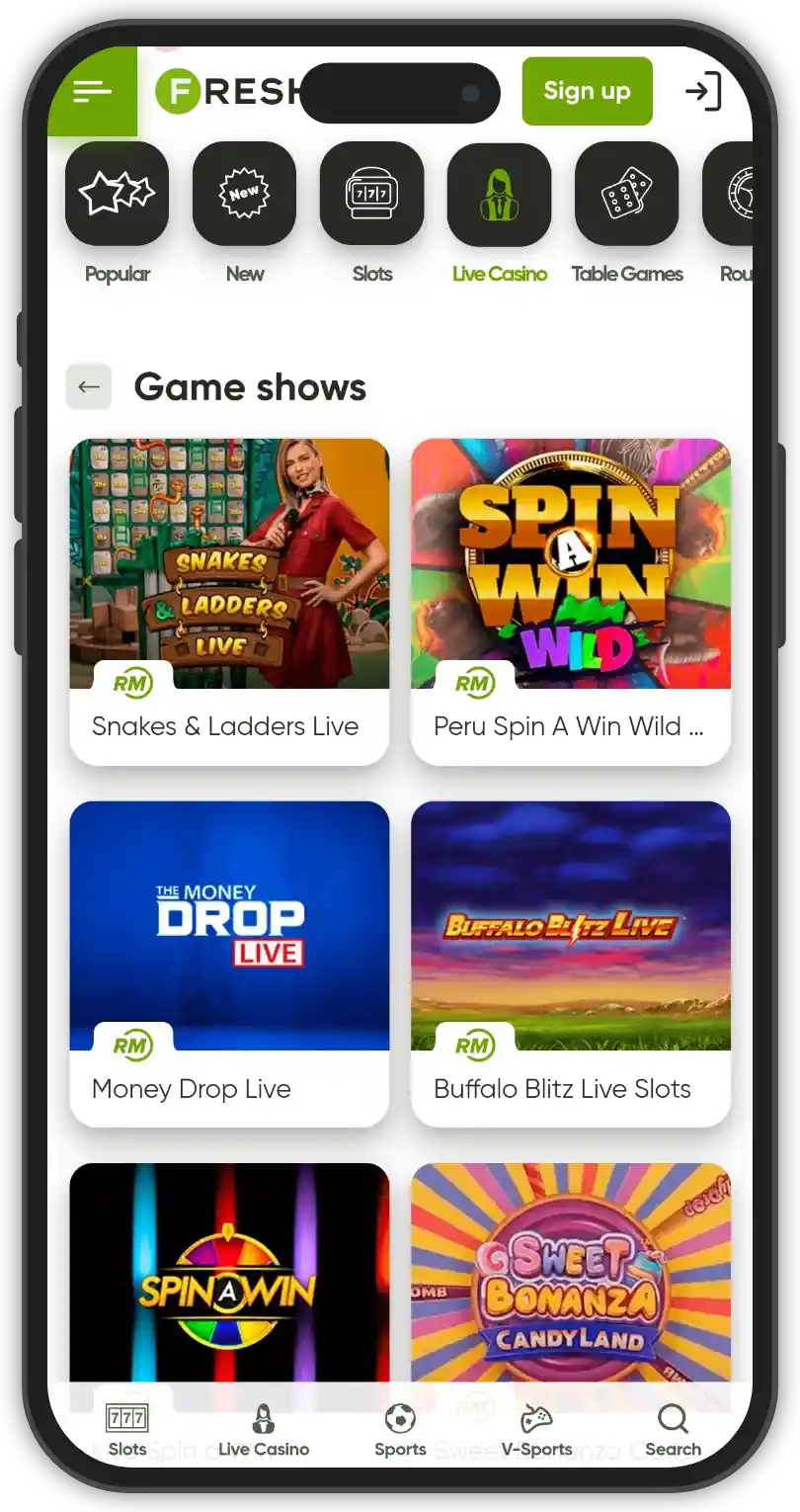 The live dealer section is equally impressive with numerous variations of popular table games. Fresh Casino has a large selection of roulette tables, as well as interesting and thrilling variants of blackjack and baccarat. Popular game shows are also featured like Sweet Bonanza Candyland, Mega Wheel and Boom City. The live dealer section is also divided into categories for every specific game type for player convenience and easy access.