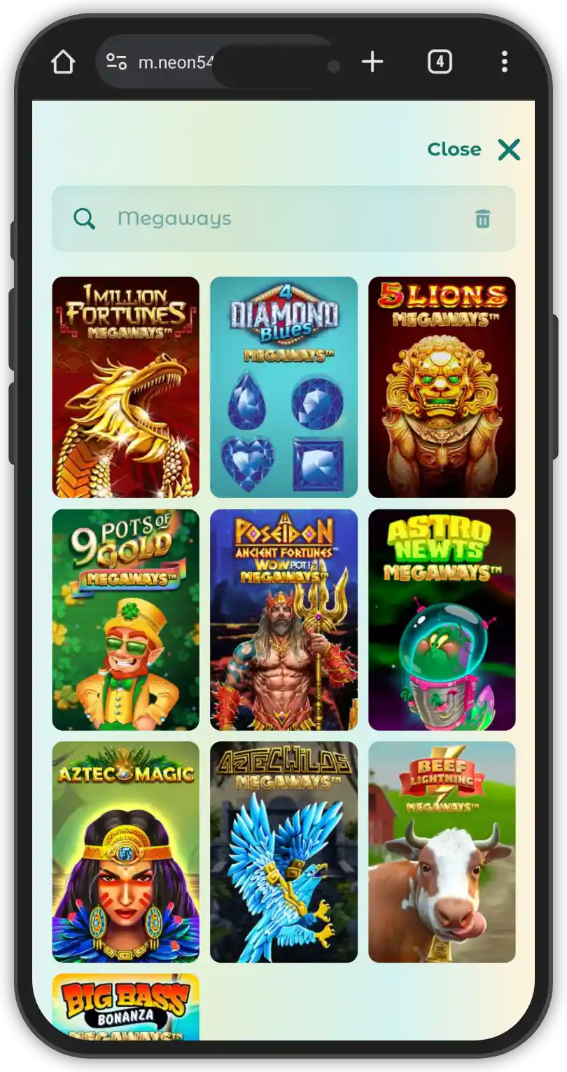 Neon54 Casino has a vast library of over 4,500 game titles powered by 93 providers. The majority consists of slots, with an impressive collection of progressive jackpots, table and card games and especially video poker. Magaways slots are also featured on the platform, however, they are hard to find, since they don’t have a separate dedicated category and the search bar displays only ten results at a time. The overall design of the website is good, with a bright neon theme, and decent filters for more convenient accessibility. It’s truly an all-inclusive and varied game offer.