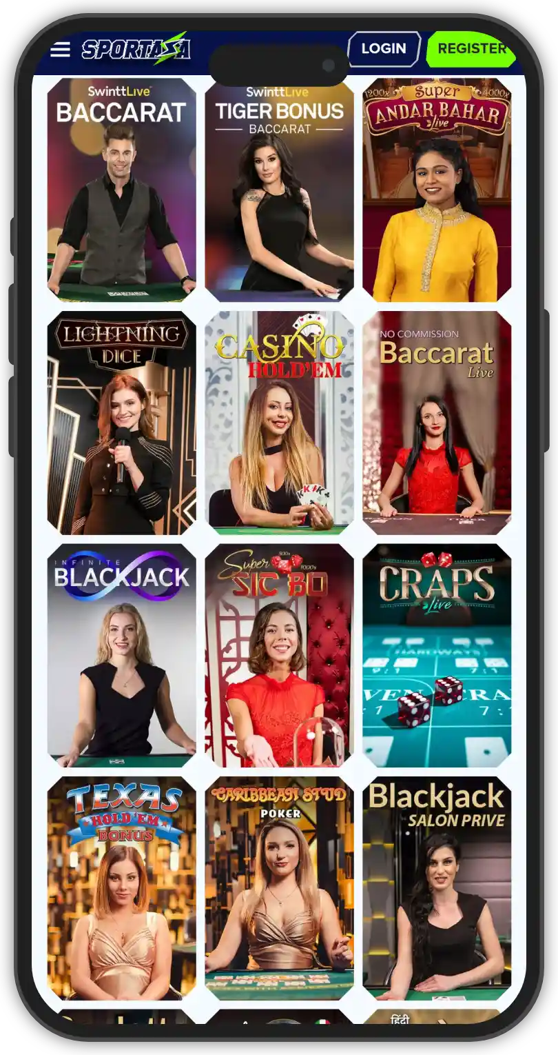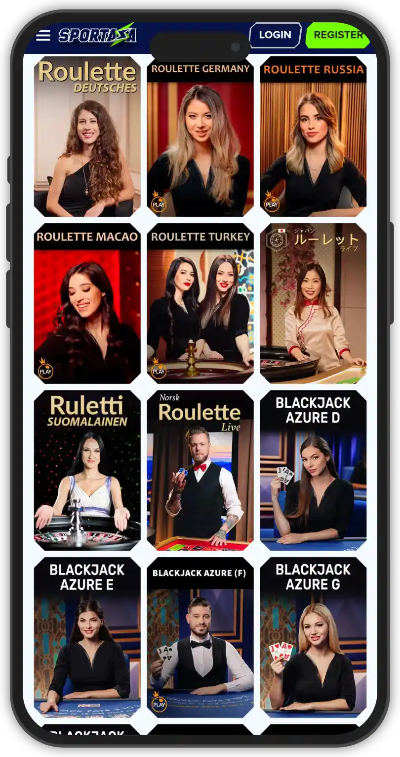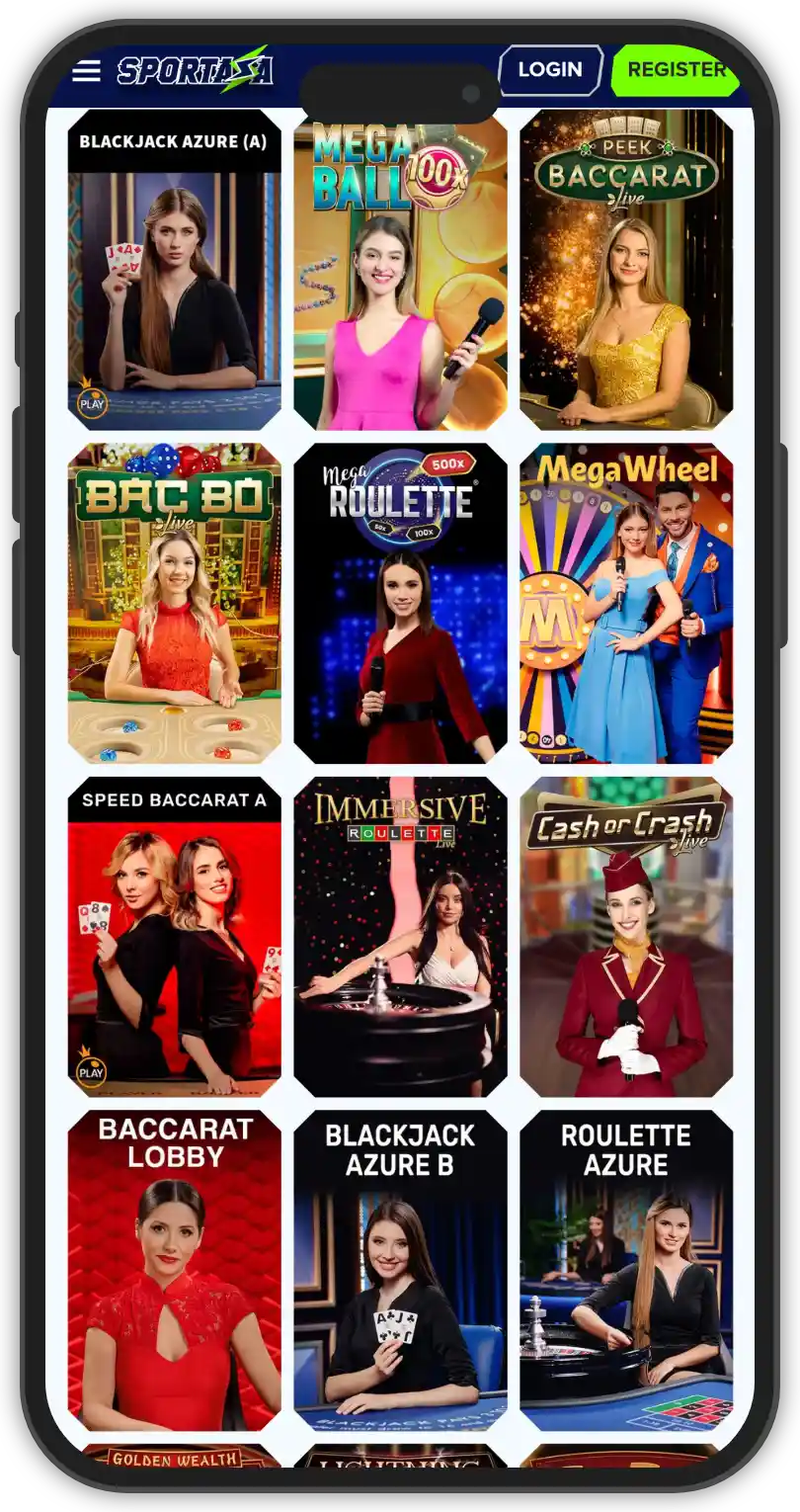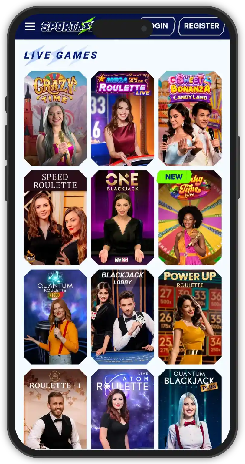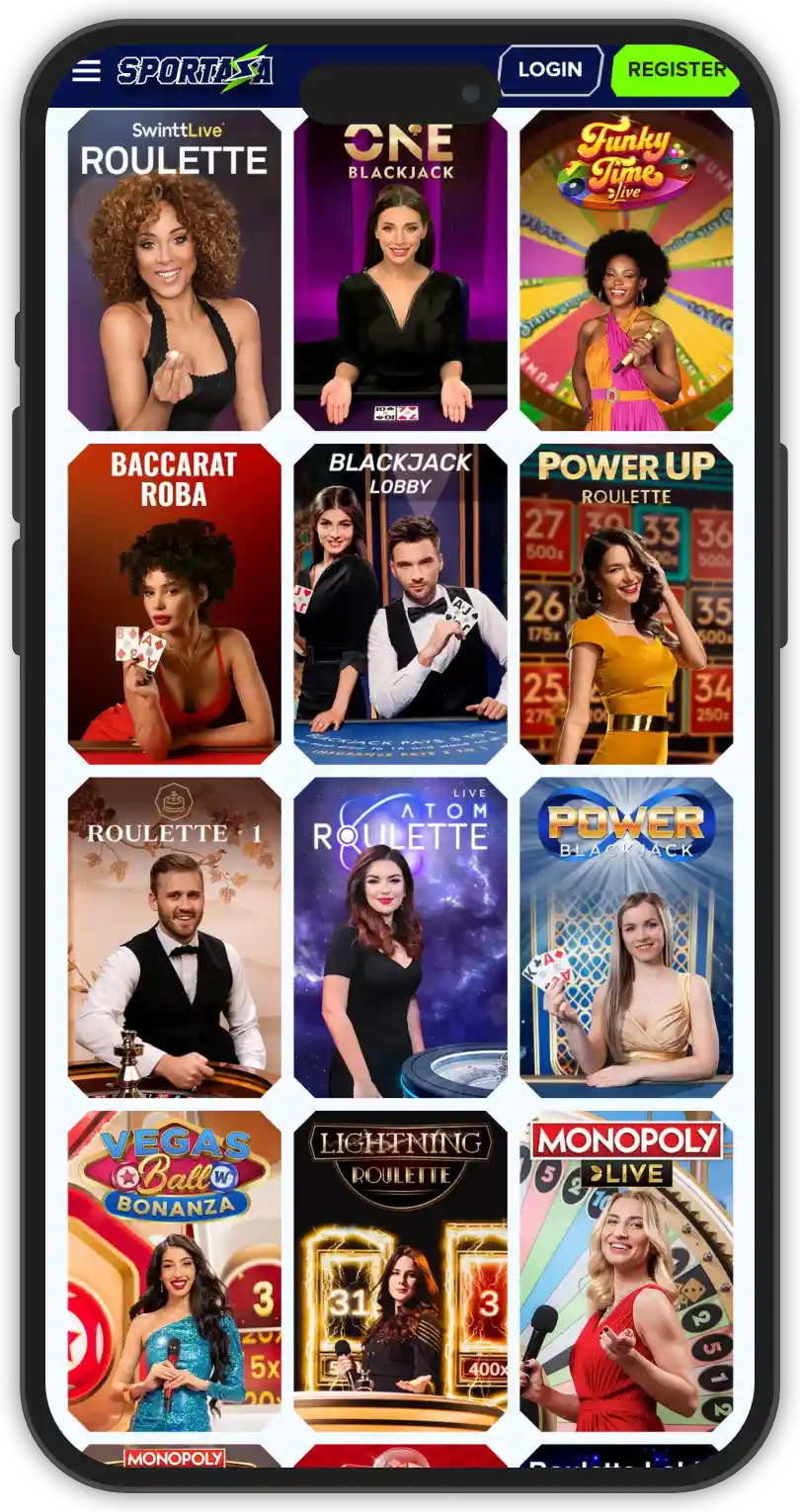 The live dealer section at Sportaza Casino is impressive, with a large selection of games in every category and plenty of different variations. You can find an array of live casino games, numerous variations of blackjack, roulette and baccarat, as well as Club Royal variants. Additionally, there is a nice selection of game shows as well, like Sweet Bonanza Candy Land, Crazy Time, and Boom City. All games are conveniently separated into their respective categories, for easy accessibility. The live dealer section at Sportaza Casino is powered by popular providers like: