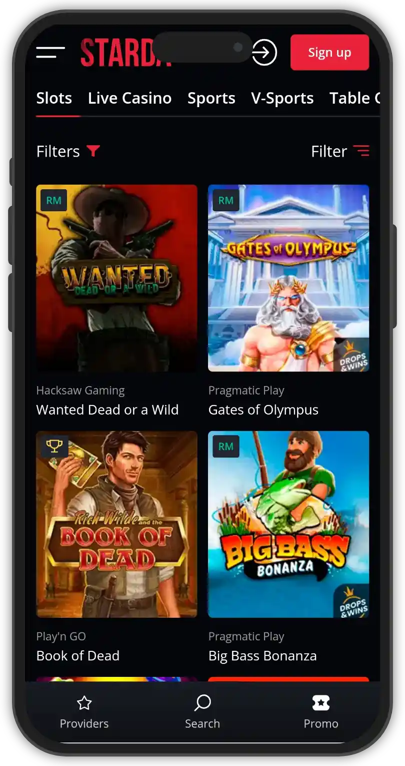 We can’t say anything special about Starda’s game lobby. It has everything you need, although the casino could do better by offering live casino bonuses. If it adds them to the list of promotions, this department would do even better.