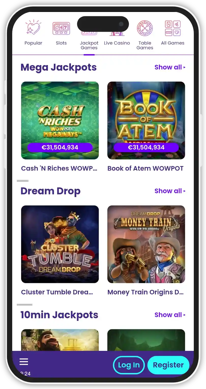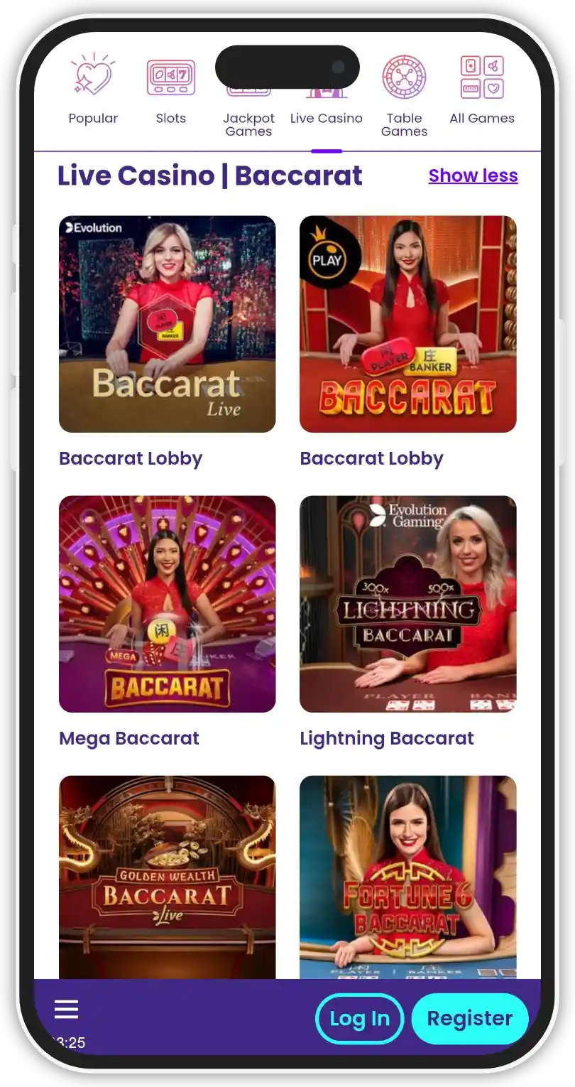 Type of games BaccaratBlackjackCrapsLive dealerMegaways slotsPokerProgressive slotsRouletteSlotsVideo poker