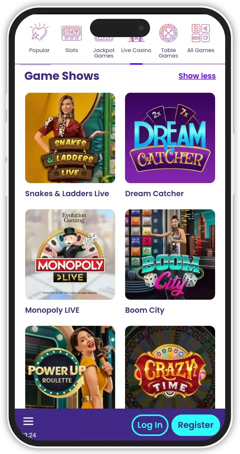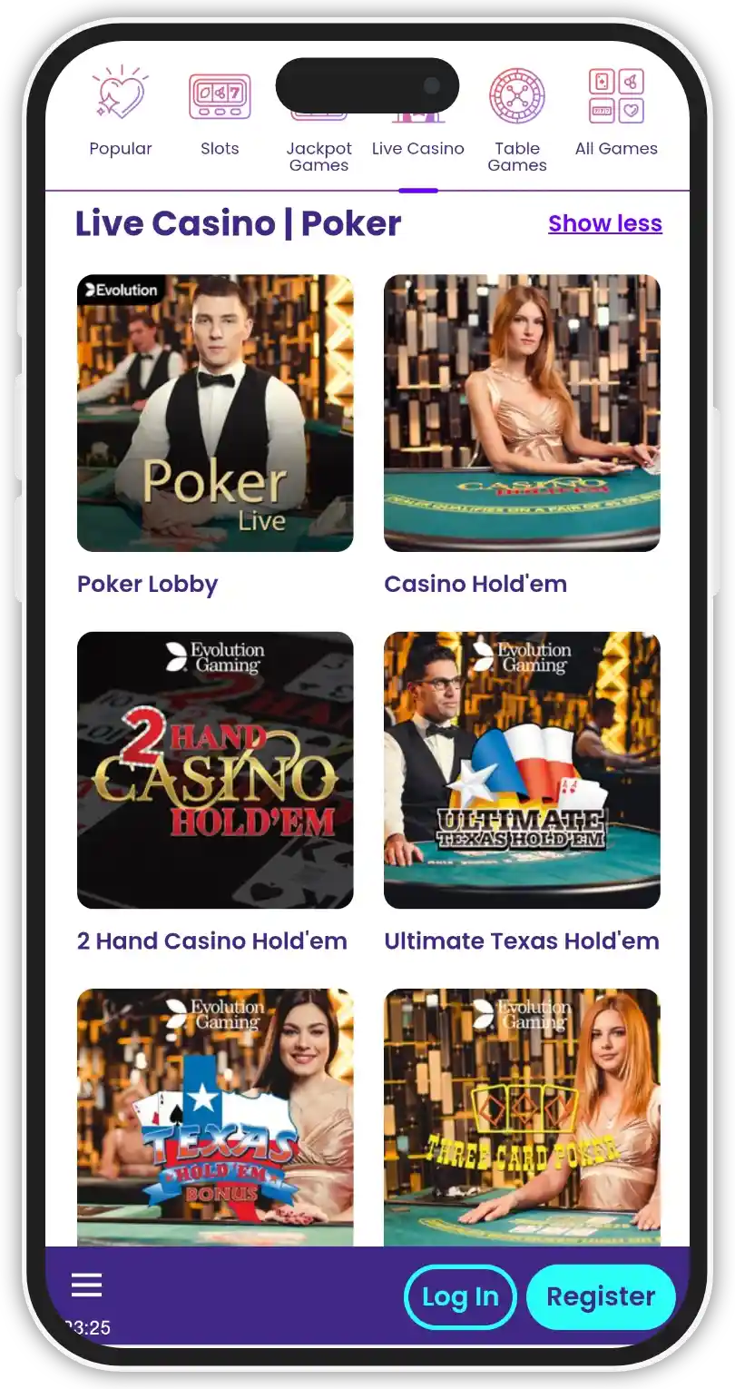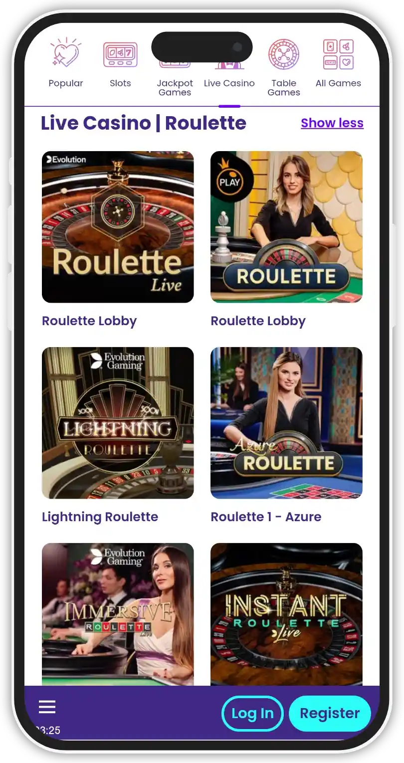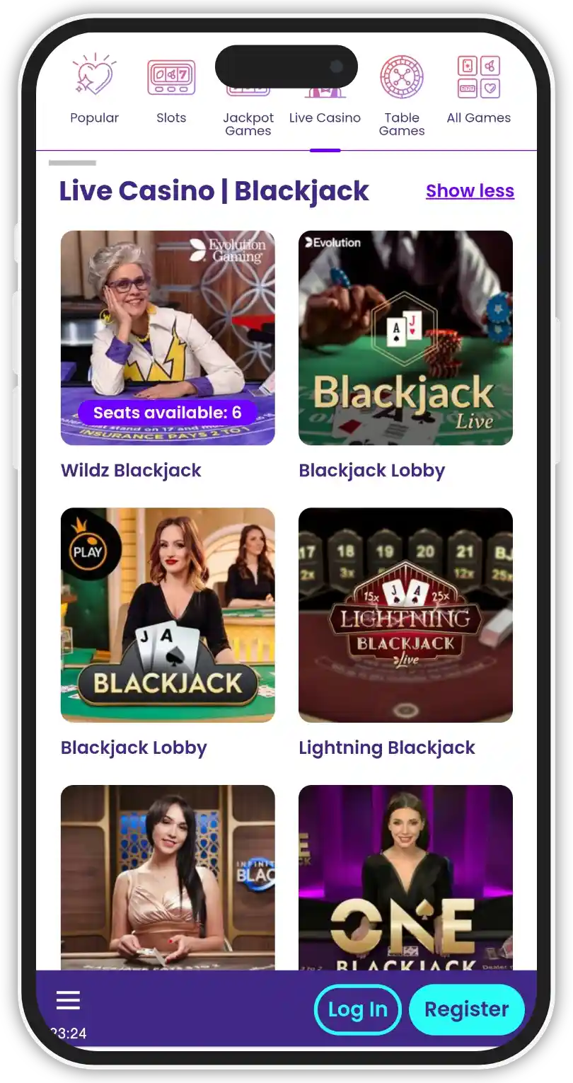 The live dealer section in Wilds Casino is provided by Evolution Gaming and Pragmatic Play Live. There is a good variety of table games, as well as live game shows. However, there are no live poker tables.
